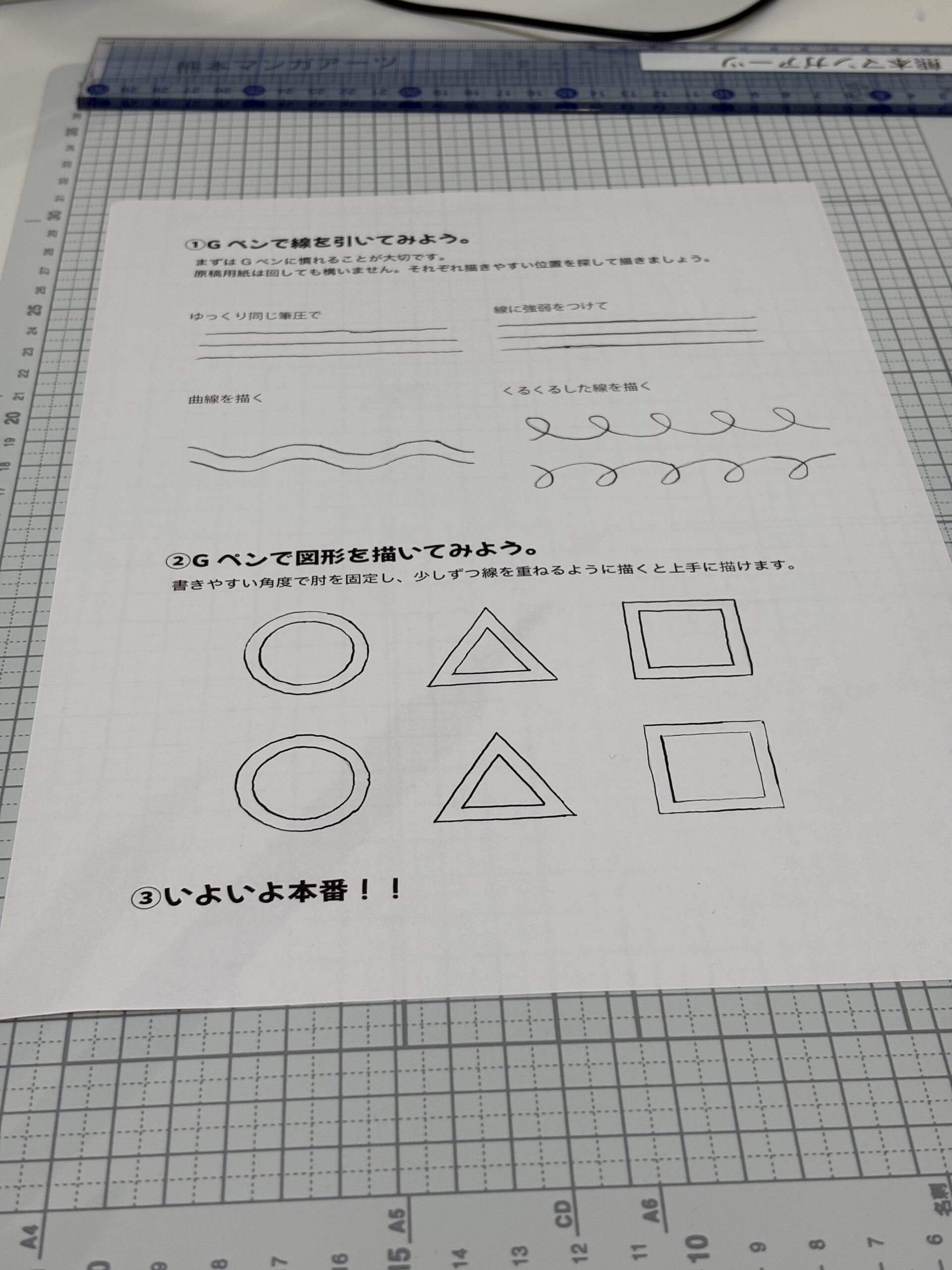 説明を受けたら、練習用紙が準備されているのでGペンに慣れる練習。