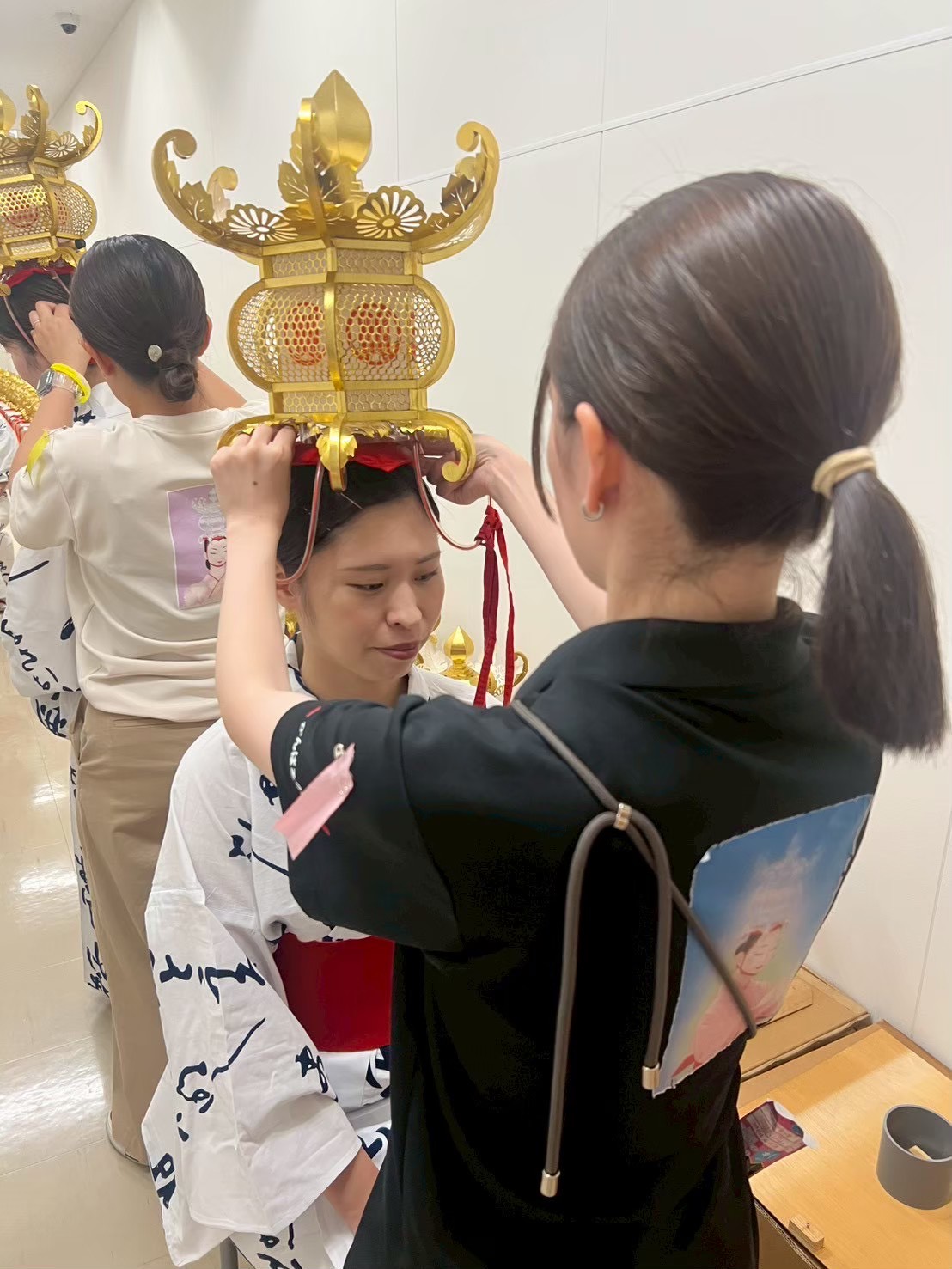 踊りの出番が近づくと、保存会の方や山鹿市の職員の方々が一人ひとりの頭に灯籠を装着していきます。灯籠は和紙で出来ているため重さはほとんど感じませんでした。