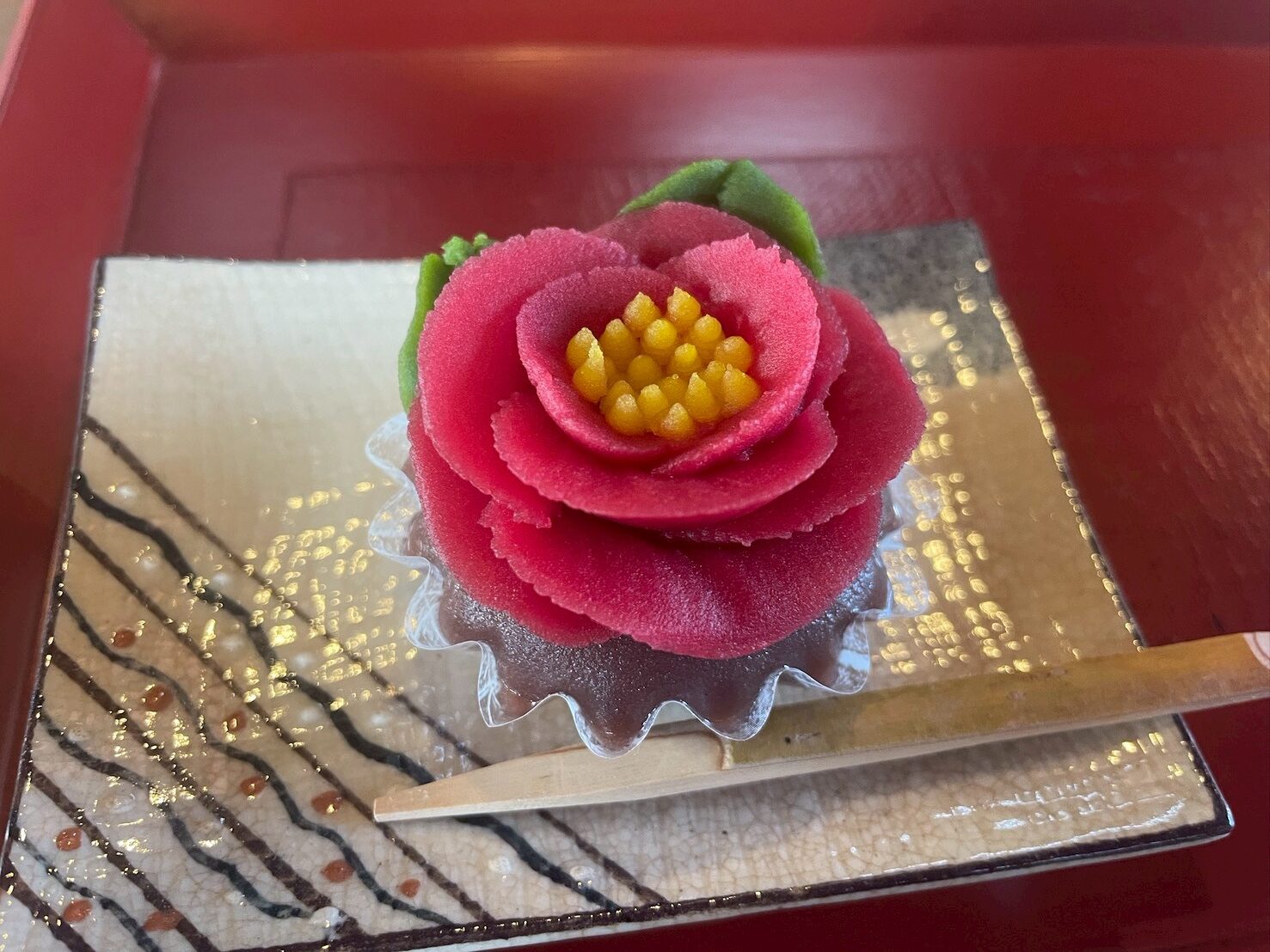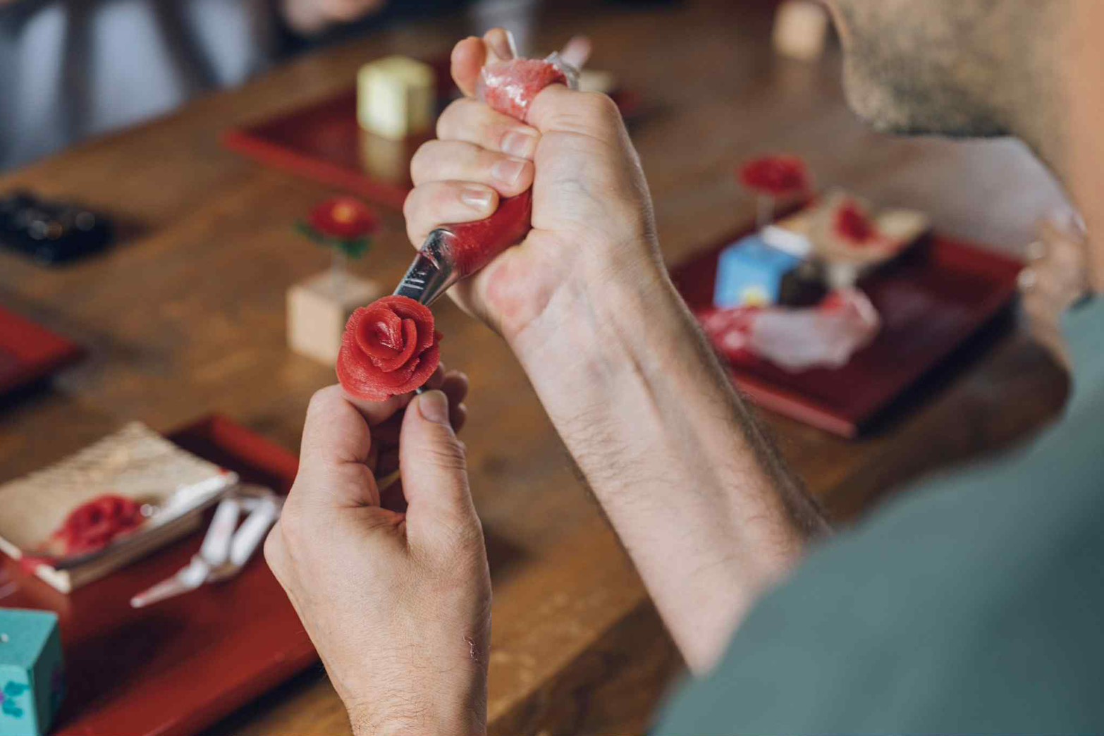 おはぎで作られた土台の上に、赤色の餡を、花びら一枚ずつ丁寧に絞りながら、美しい椿の花を完成させていきます。