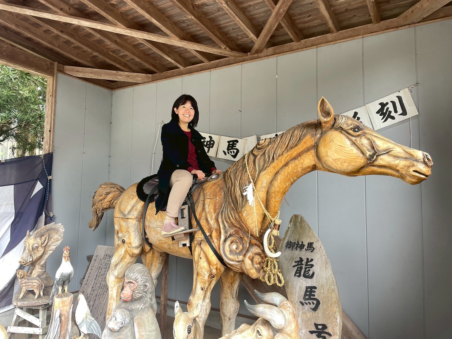 今年は午年ということで、城所氏が彫り上げられた巨大な御神馬にも乗ってみましたが、こちらも躍動感のある素晴らしい彫刻です。