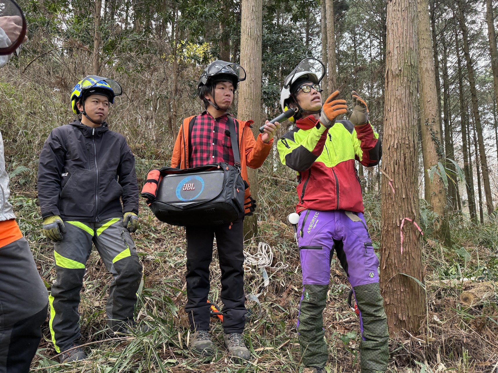 國武林業株式会社國武智仁先生より、1動作ごとに注意すべきこと、コツ、待避方法、忘れてはいけない事の指導を受けました。