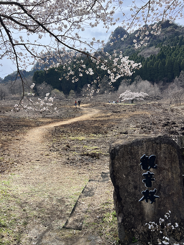 野焼き後の大地と淡いピンクのコントラストは、この時期の阿蘇ならではの絶景です。風が強く少し冷える日には、温かいコーヒーを一杯。五岳を背にした一本桜を独り占めする時間は、何物にも代えがたい幸せなひとときです。