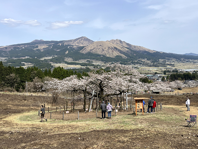 この場所は普段は立ち入りが制限されていますが、桜の咲く期間だけ牧野管理組合によって開放され、近くで鑑賞することができます。草原の中に大きく枝を広げた桜の古木は、阿蘇の山々に向かって手を広げているような凛とした佇まい。