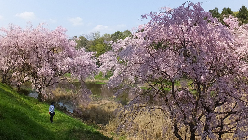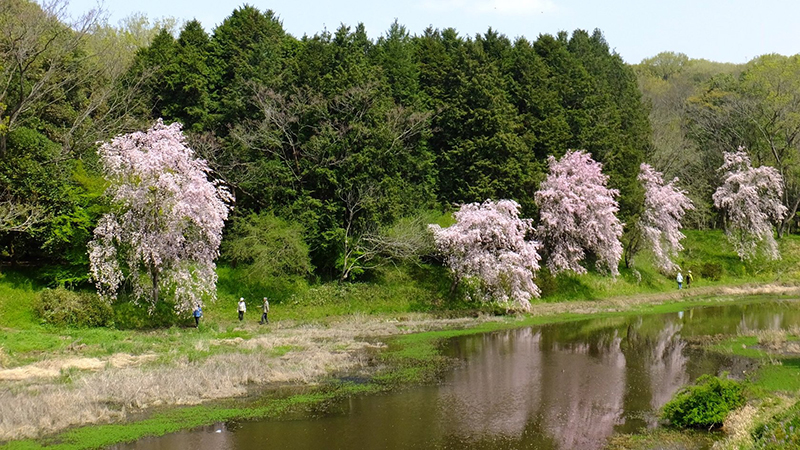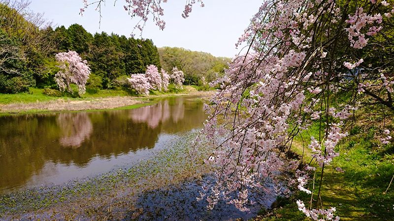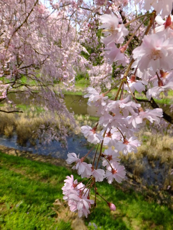 池を囲むように咲き誇る見事なしだれ桜の群落は、水面にその姿を映し出し、まるで桃源郷のような幻想的な世界を作り上げます。しだれ桜はソメイヨシノよりも1週間ほど遅く満開を迎えるため、お花見シーズンの締めくくりとして訪れるのもおすすめですよ。