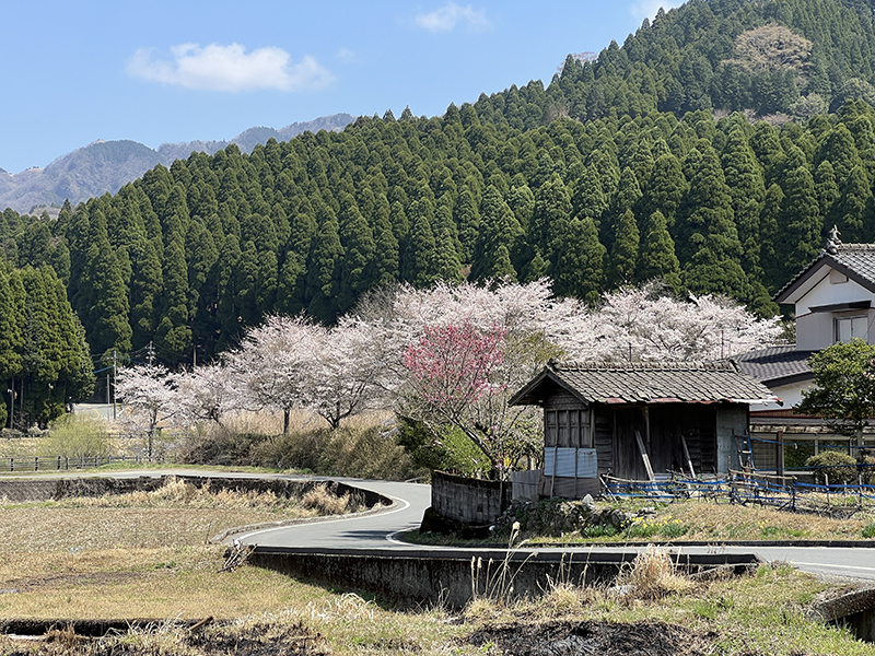 南阿蘇をドライブしていると、ふとした瞬間に「ふるさと」という言葉がぴったりの、桜と民家が織りなす穏やかな風景に出会えるのも魅力。移住者たちがこの村の空気感に惚れ込む理由がわかる気がします。